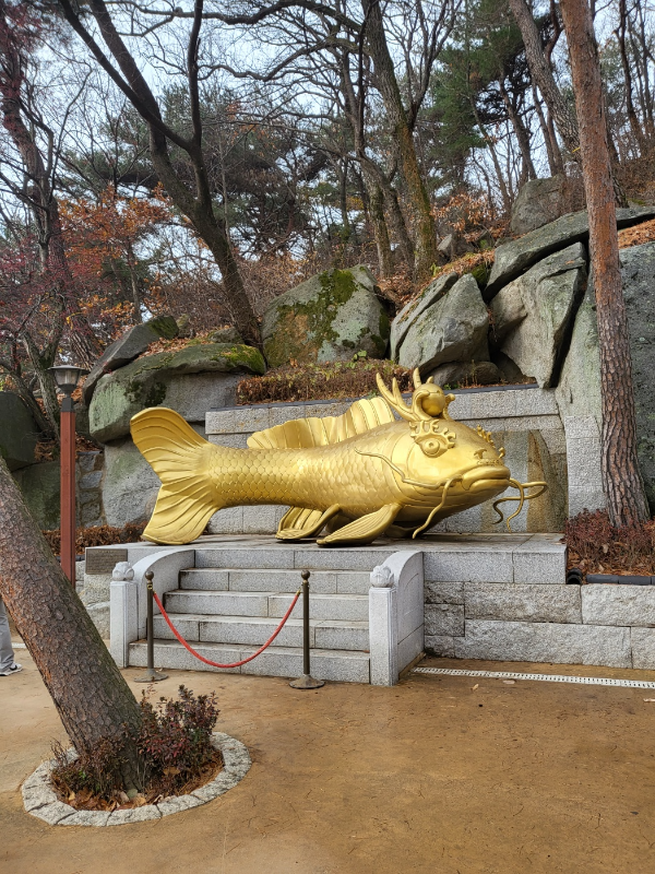 잉어 형상의 조각물도 있는데 이는 강화 보문사 황금잉어 조성 연기문이 써져 있었습니다. 강화석모도 보문사에선 국내 유일의오방 용왕을 모신 용왕전 건립에 이어 청동주물 황금잉어를 조성하였습니다. 잉어는 늘 깨어있는 물고기처럼 수행이나 학문을 정진하라는 의미가 있고, 한 번에 많은 알을 낳아 다산, 자손의번영, 그리고 재물을 상징합니다. 또한 어룡변성도의 잉어 그림에서처럼 일반인에게는 장원 급제, 스님들에게는 성불을 의미하기도 합니다. 이에 많은 불자님들의 염원을 담아 불기2568년 갑진년에 황금잉어를 조성하였습니다. 황금잉어 조성불사 회향식을 맞이하여 동참하여 주신 모든 불자님들의 무량한 공덕과 복락이 함께하기를 발원합니다. 라고 적혀 있는데 2024년 올해에 만든 것이었네요.