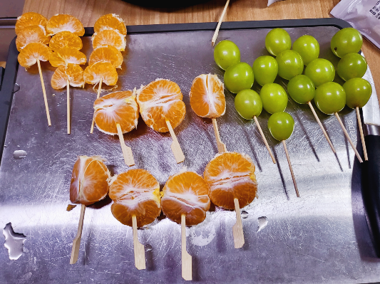 저는 후라이팬에 시럽을 데워놓는 시간에 꼬챙이로 방울토마토나 샤인머스켓 귤, 사과 등을 꼬챙이에 꽂아주고 있었습니다. 이때 중요한 점은 물기 없게 키친타올로 꼼꼼히 닦아 주는 것입니다. 준비된 과일 꼬챙이들을 코팅시켜줍니다.