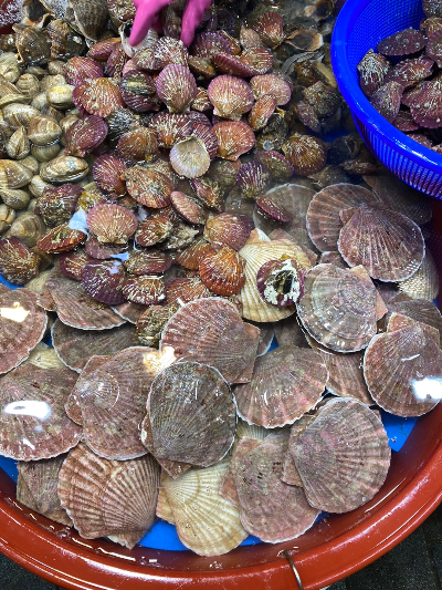 이곳저곳 생선구이 집도 보이고 싱싱한 해산물들이 많이 보이더라구요. 홍가리비가 제철이라 찾는것은 어렵지 않았습니다. 근데 사장님이 알려주신 정보가 있는데 홍가리비는 육지로 나오면 금방 죽어 버리는것들이 많아서 잘 안 갖다 놓는다고 하시네요. 그리고 홍가리비 중에 조금 가볍다싶은것들은 속안을 들여다 보면 비어있는것도 있었습니다.